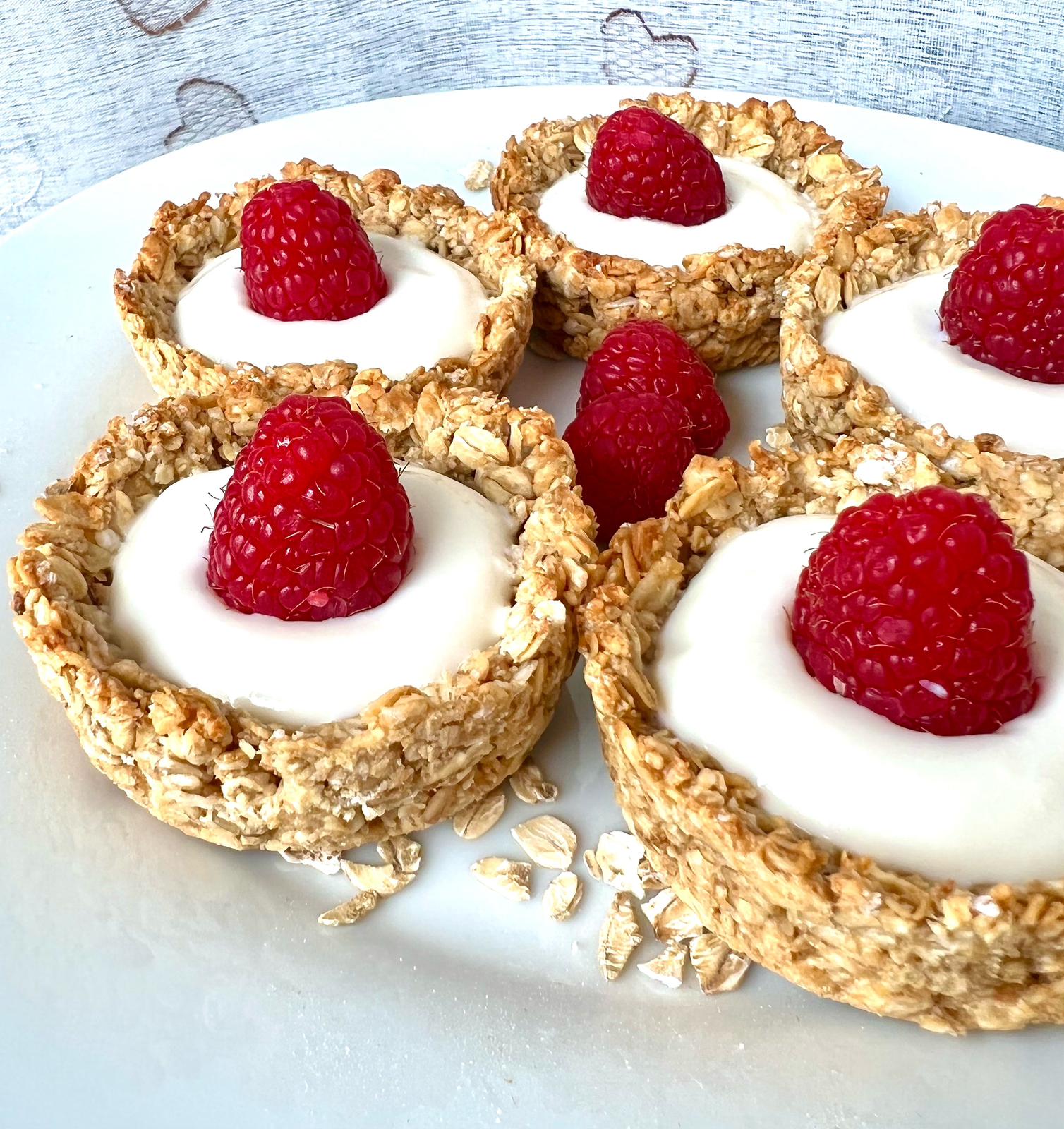 Ingredienti - 60 g di fiocchi di avena neutri - 60 ml di albume - 10 g di miele - 10 g di crema 100% arachidi - 150 g di yogurt di soia bianco senza zuccheri - 10 g di proteine in polvere aromatizzate - Lamponi q.b. Procedimento Unire