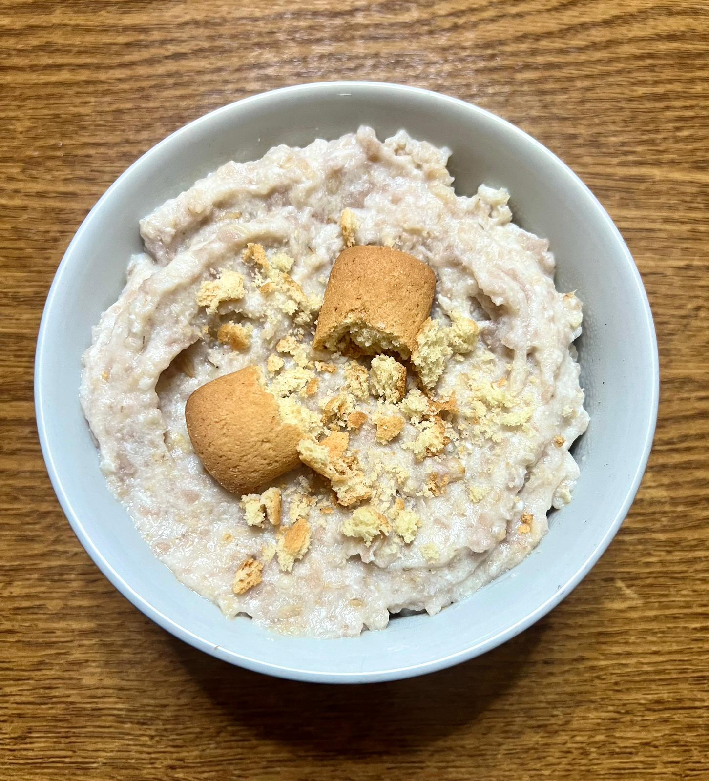 Ingredienti - 30 g di fiocchi di avena neutri - 20 g di farina di riso/avena aromatizzata al biscotto - 200 ml di acqua - 80 ml di albume - 10 g di proteine in polvere aromatizzate al biscotto - 1 biscotto a scelta Procedimento Cuocere sul gas