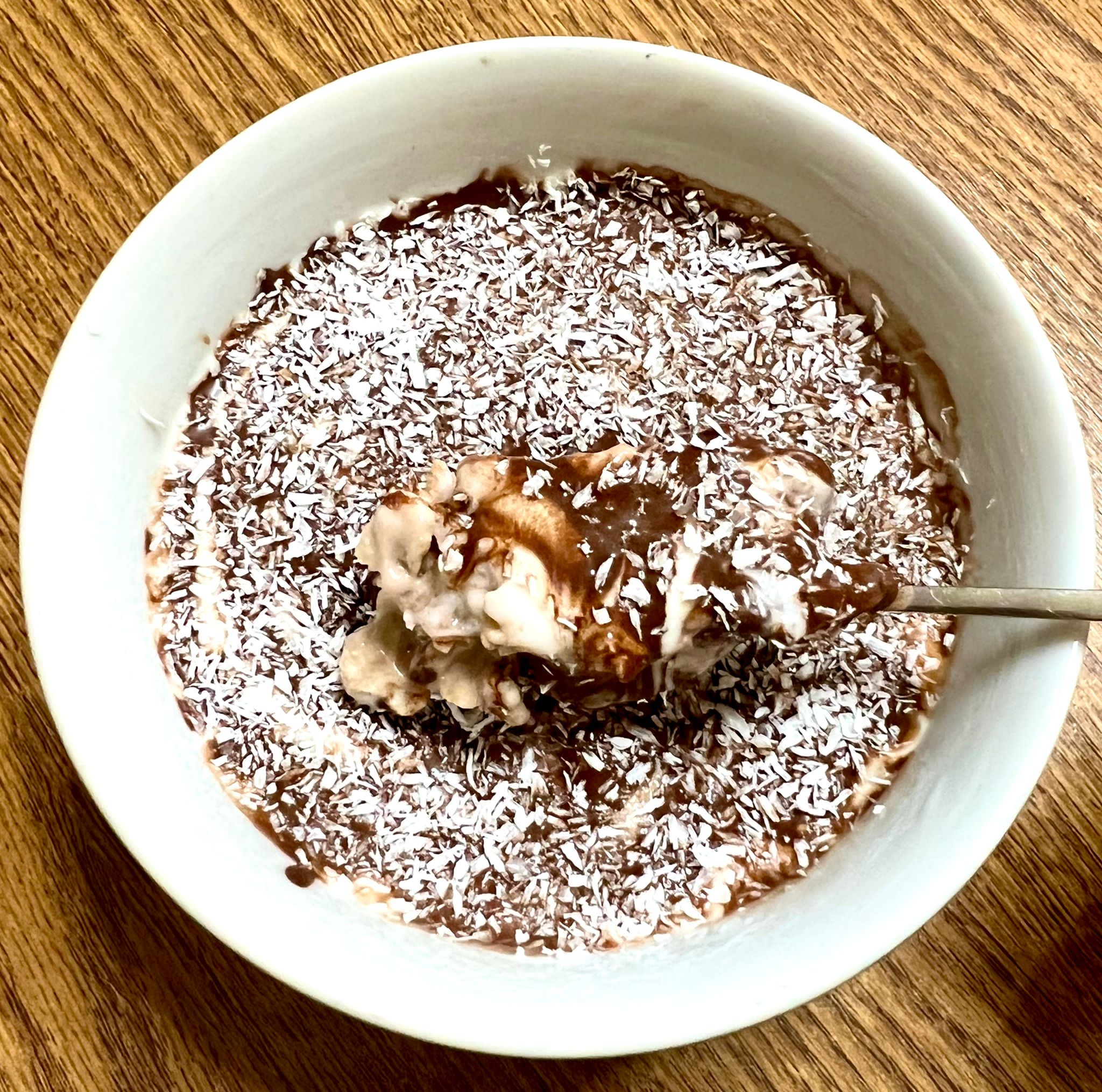 Mescolare il riso soffiato con lo yogurt di soia precedentemente amalgamato alle proteine al cocco e a 15 g di cocco grattugiato e versare il composto ottenuto in una tazza capiente. Aggiungere in superficie la cremina di cacao ottenuta mescolando il cacao amaro con il dolcificante e l’acqua. Completare con 5 g di cocco grattugiato e conservare in frigo per 3-4 ore o in freezer per 30 minuti.