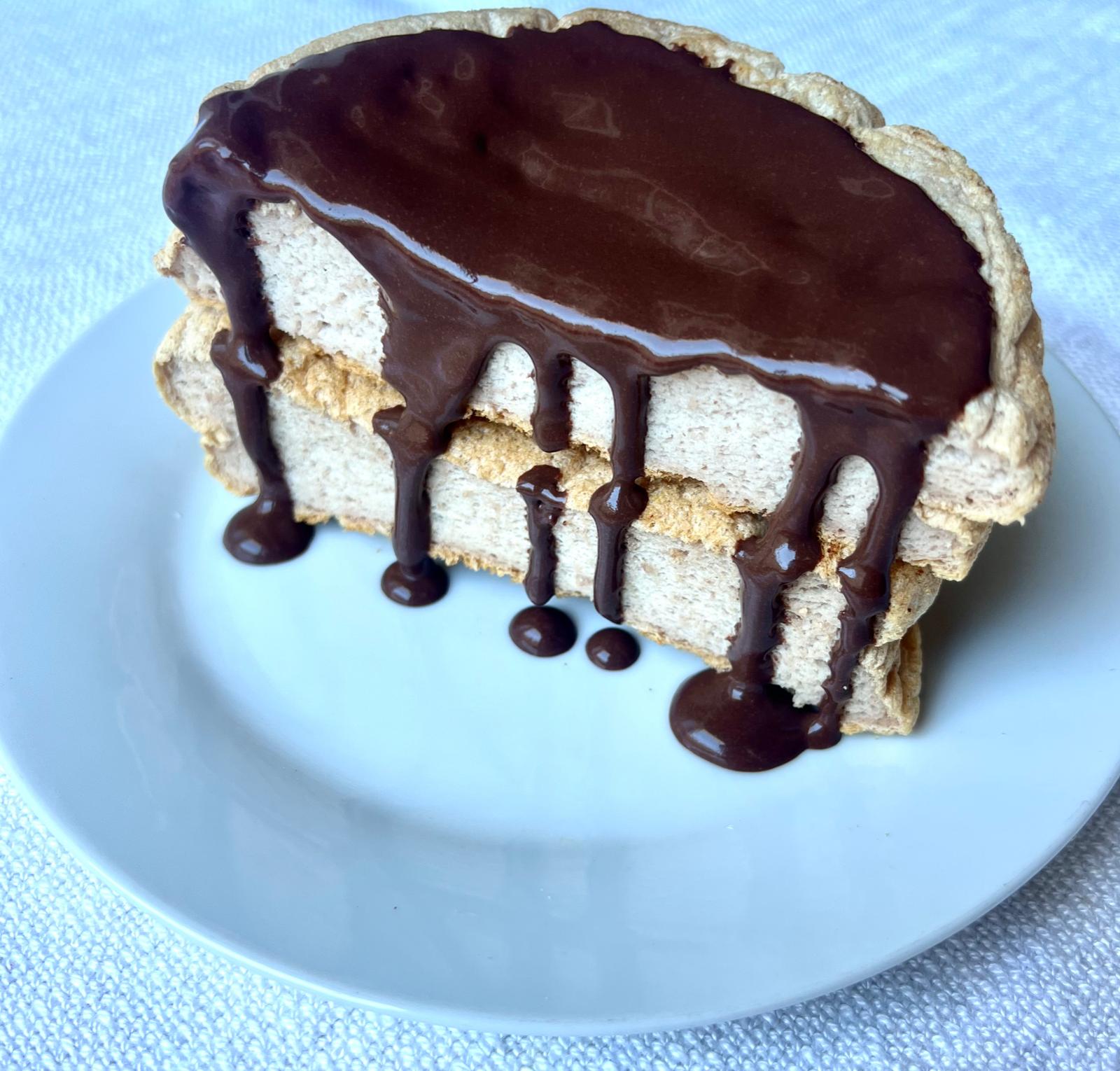 stretti (diametro consigliato 16 cm) e leggermente unto di olio e versare il composto, cuocendo a fiamma molto bassa per circa 15 minuti da un lato e 10 minuti dall’altro. Una volta cotto, tagliarlo in due, sovrapporre le due metà e completare con una cremina ottenuta mescolando le caseine al cioccolato, con il cacao amaro e l’acqua.