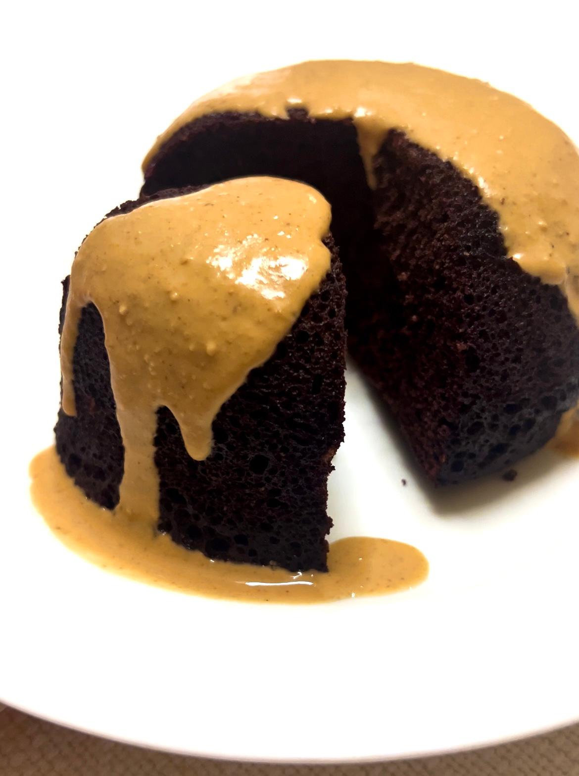 contenente il composto, una tazzina da caffè piena di acqua. Una volta cotto il tortino, estrarlo dalla tazza e completare con la crema 100% arachidi in superficie.
